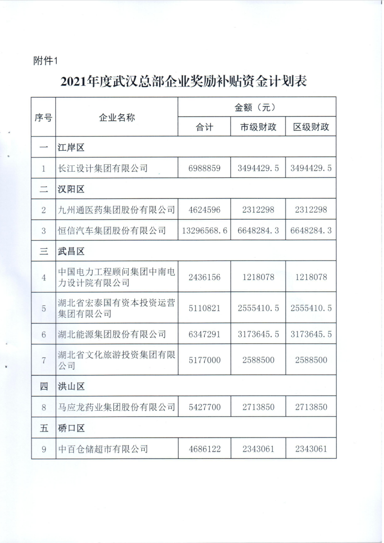 市發展改革委關于下達2021年度武漢總部企業獎勵補貼資金計劃的通知